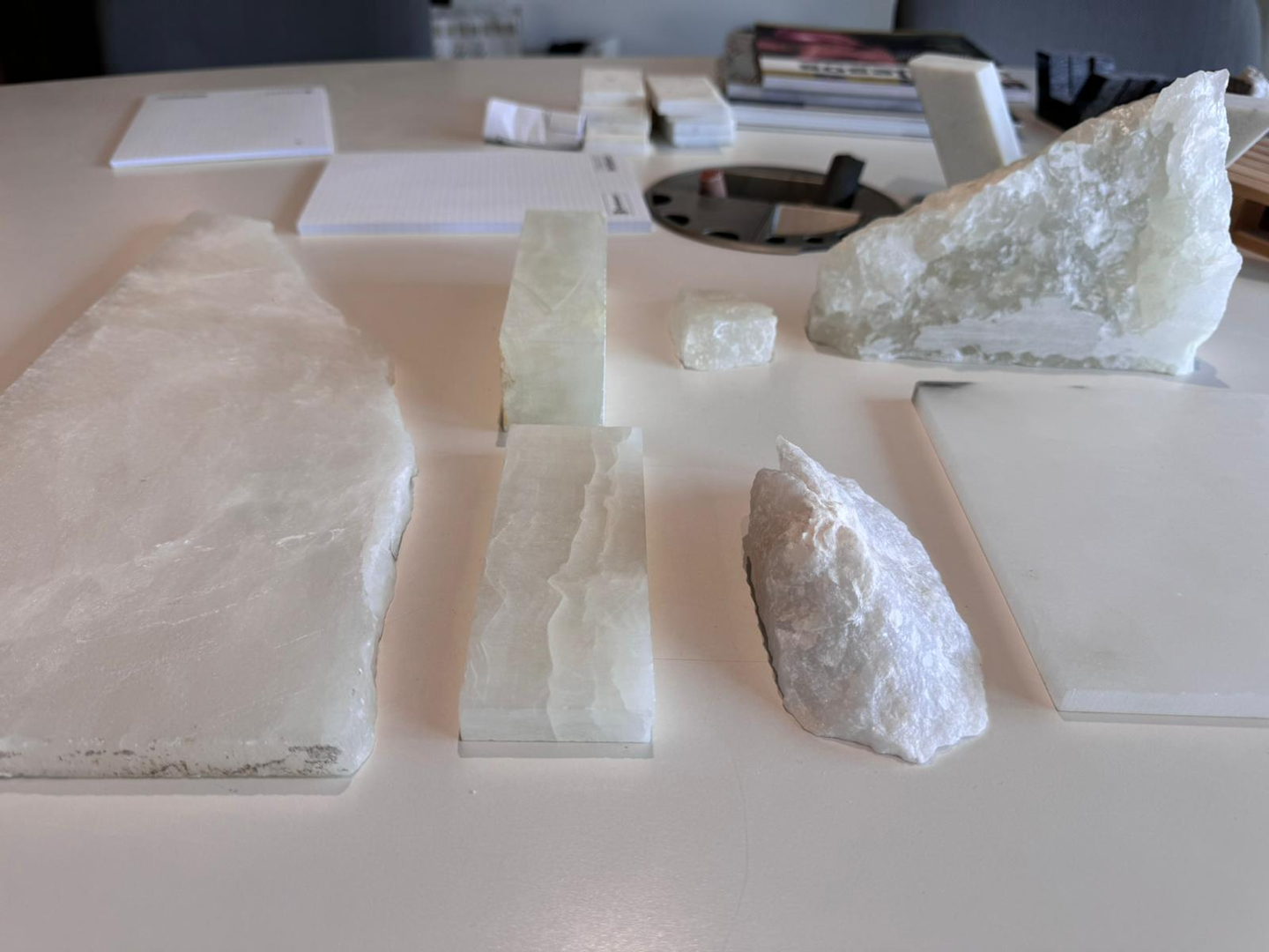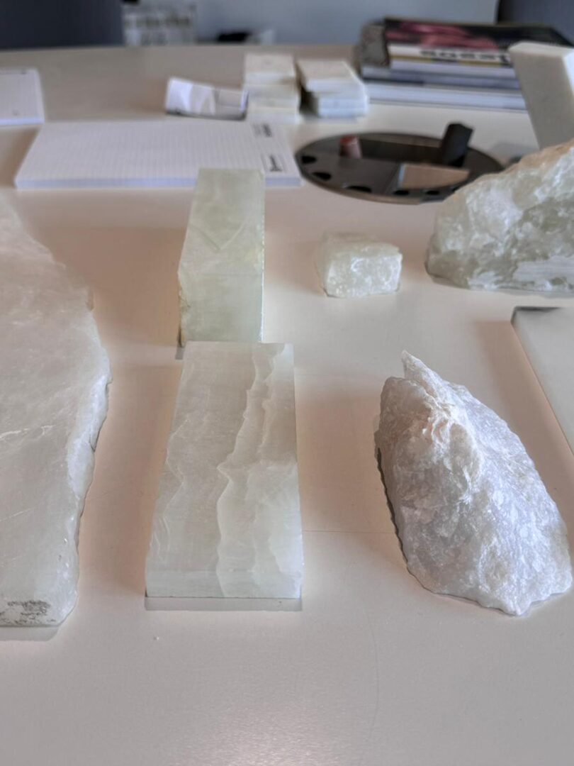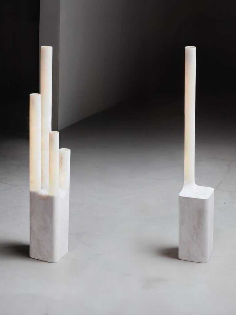 La colección «Altar» se presenta principalmente en alabastro, una piedra translúcida que realza la belleza etérea de la luz. Las AP de esta pieza fueron elaboradas en mármol vietnamita, con el objetivo de explorar las posibilidades expresivas de diferentes materiales.